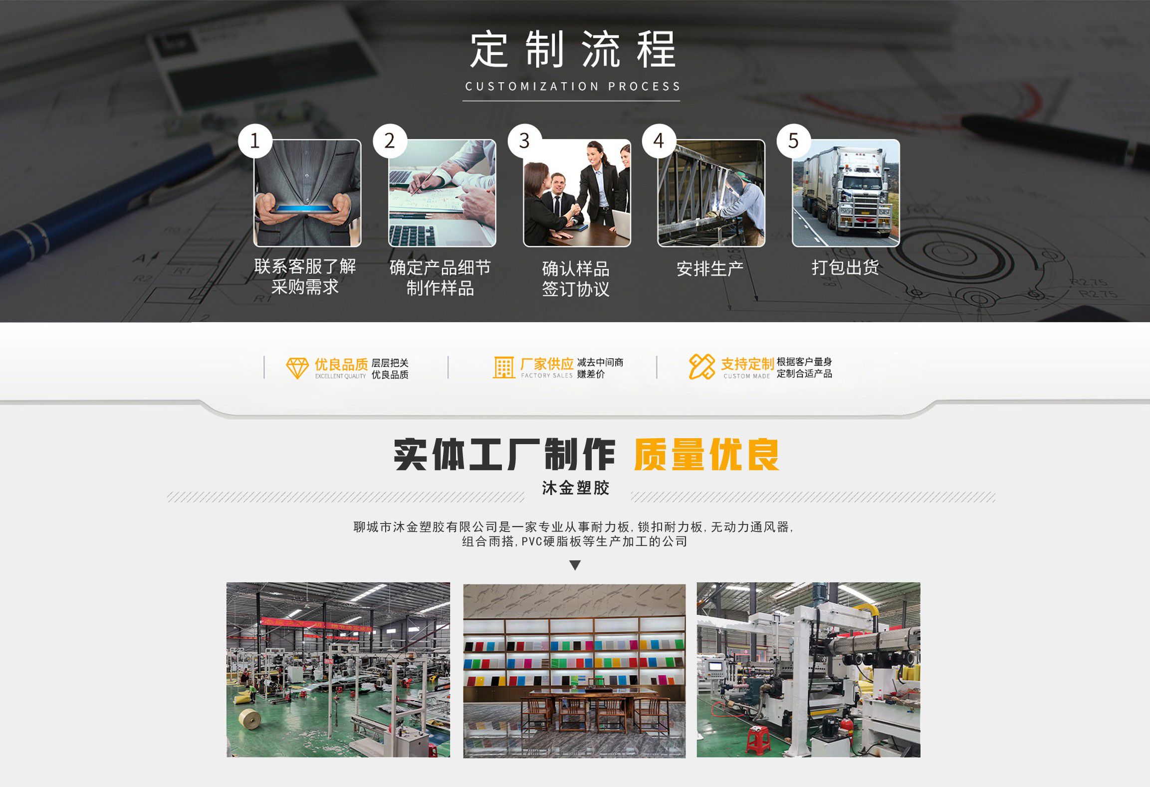 聊城市沐金塑膠有限公司注冊資金2180萬元,占地20000余平方,擁有自建廠房15000平方,員工100余名。10余年來,公司主營耐力板,鎖扣耐力板,耐力板深加工,無動力通風器,組合雨搭,PVC硬脂板,耐力板廠家等板材的發(fā)展戰(zhàn)略,逐漸成長為綜合性企業(yè)。 公司擁有多條板材共擠生產(chǎn)線,采用世界知名品牌進口原材料和先進工藝,依據(jù)完善的ISO9001質(zhì)量管理體系和ISO14001環(huán)境管理體系,為產(chǎn)品的卓越品質(zhì)提供了強有力的保證。憑借過硬的創(chuàng)新能力和堅實的硬件基礎,贏創(chuàng)已成為國內(nèi)領先的熱塑性板材生產(chǎn)商,產(chǎn)品被廣泛應用于建筑業(yè)、農(nóng)業(yè)、工業(yè)、廣告業(yè)、安防行業(yè)及DIY領域。 公司始終致力于通過提供最優(yōu)的板材應用解決方案,為客戶創(chuàng)造最高的價值;堅守創(chuàng)新、質(zhì)量、靈活、服務和速度的核心價值觀;堅持“完美的產(chǎn)品需要完美服務的支持”的經(jīng)營理念,努力實現(xiàn)成為世界領先的板材與解決方案供應商的夢想。 在未來,公司將立足客戶需求,不斷改變和完善現(xiàn)有產(chǎn)品,拓展產(chǎn)品線和充分開發(fā)板材的應用領域,為客戶創(chuàng)造全方位的價值。同時更好地實現(xiàn)員工的價值,實現(xiàn)公司團隊的價值。我們將與您一起創(chuàng)贏未來! 企業(yè)使命:成為世界領先的板材與解決方案供應商。 公司愿景:通過提供最優(yōu)的板材應用解決方案,為客戶創(chuàng)造最高的價值。 核心價值觀:質(zhì)量...